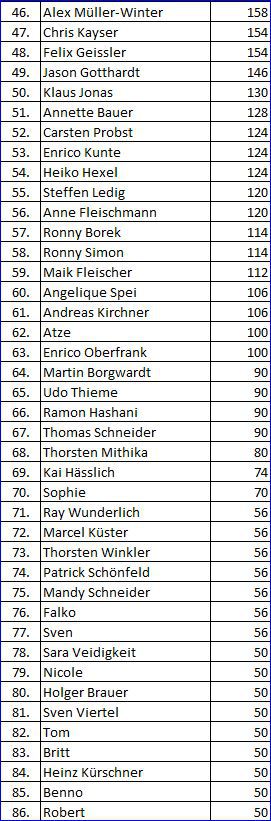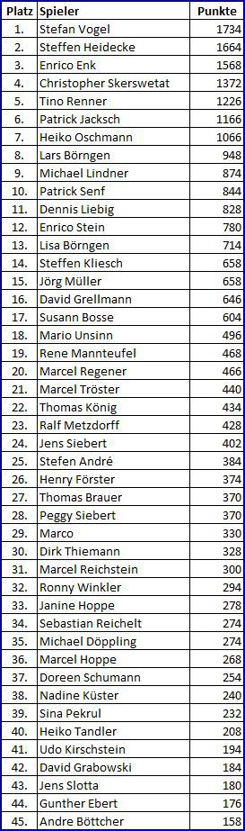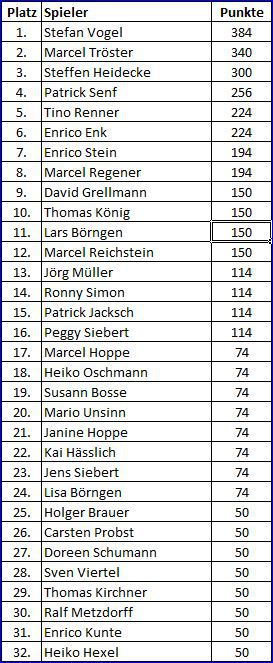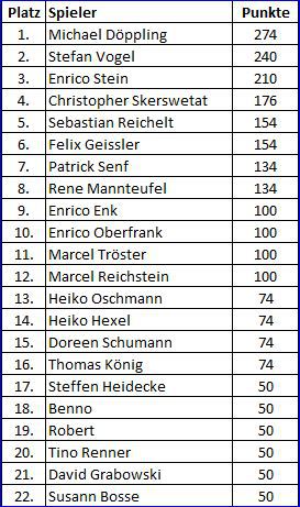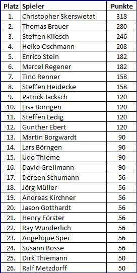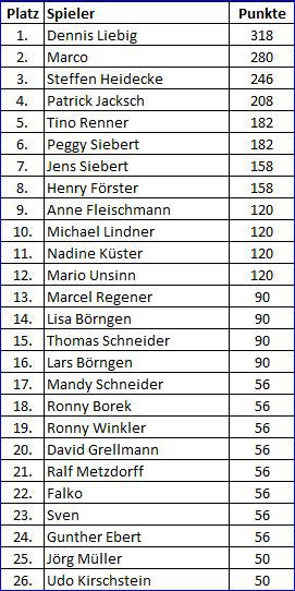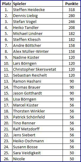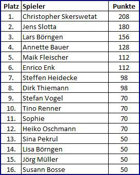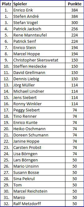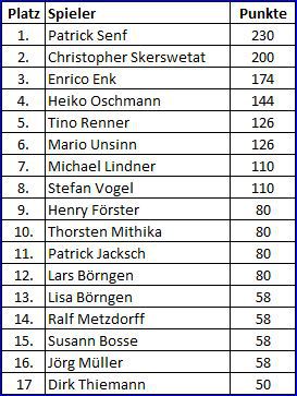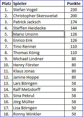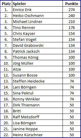 Auf Grund von diversen Terminvorschlägen, an denen die Teilnehmer zeitlich nicht verfügbar waren, wird das 11. Ranglistenturnier am 01.08.2020 um 20:00 Uhr in der Weiberwirtschaft zu Ende gespielt und ausgezahlt.
